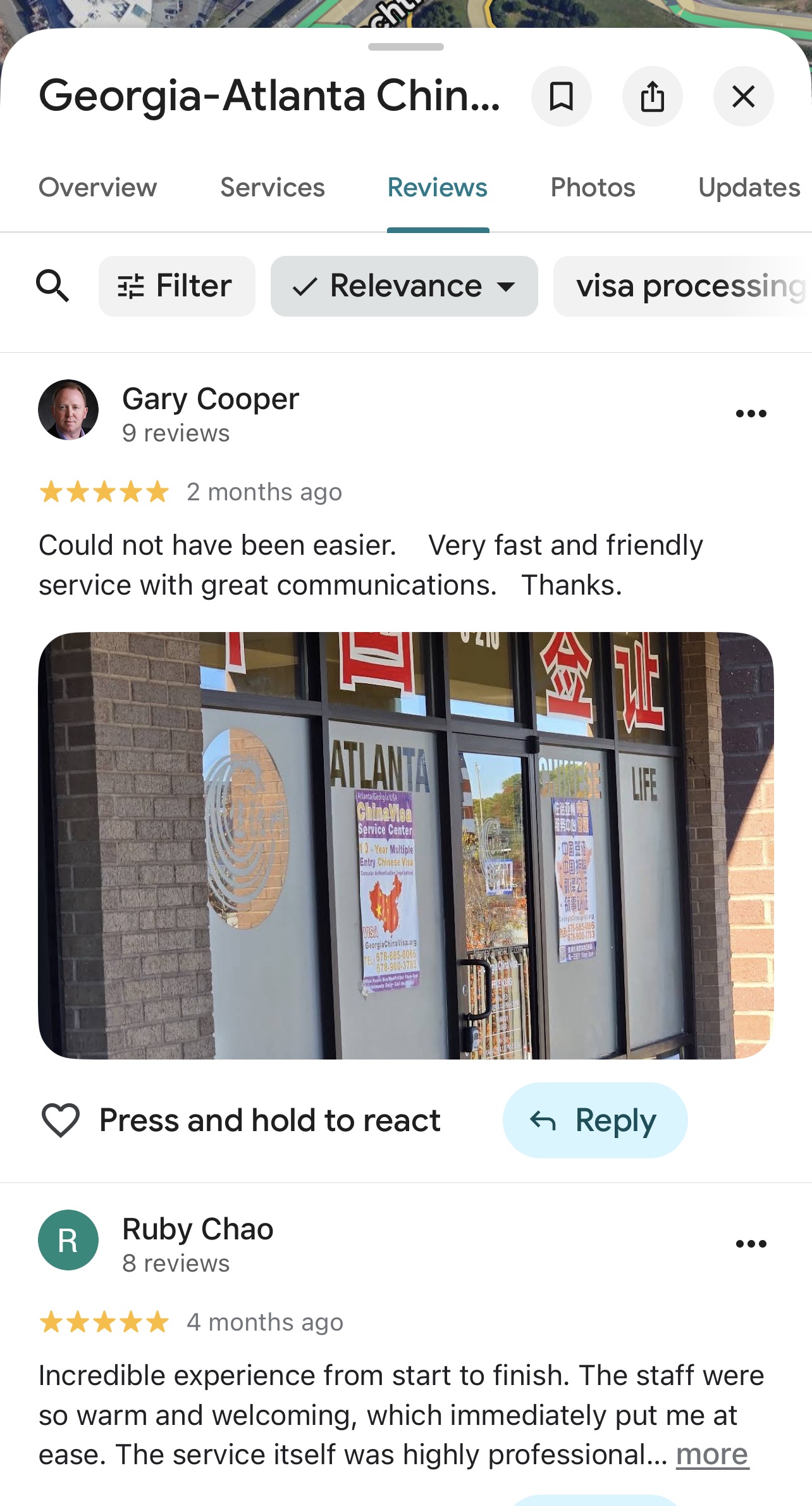 感谢您使用佐治亚-亚特兰大中国签证服务中心。如果你满意我们的服务,麻烦使用我们取件时发给你的谷歌商家链接,留下你的5星好评,以便我们更好的为美东南各州的朋友服务。